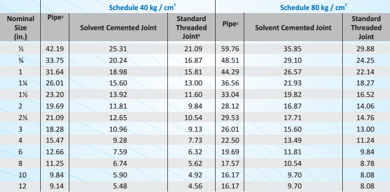 Pressure Ratings for uPVC Schedule 40 and Schedule 80 as per ASTM D-1785: